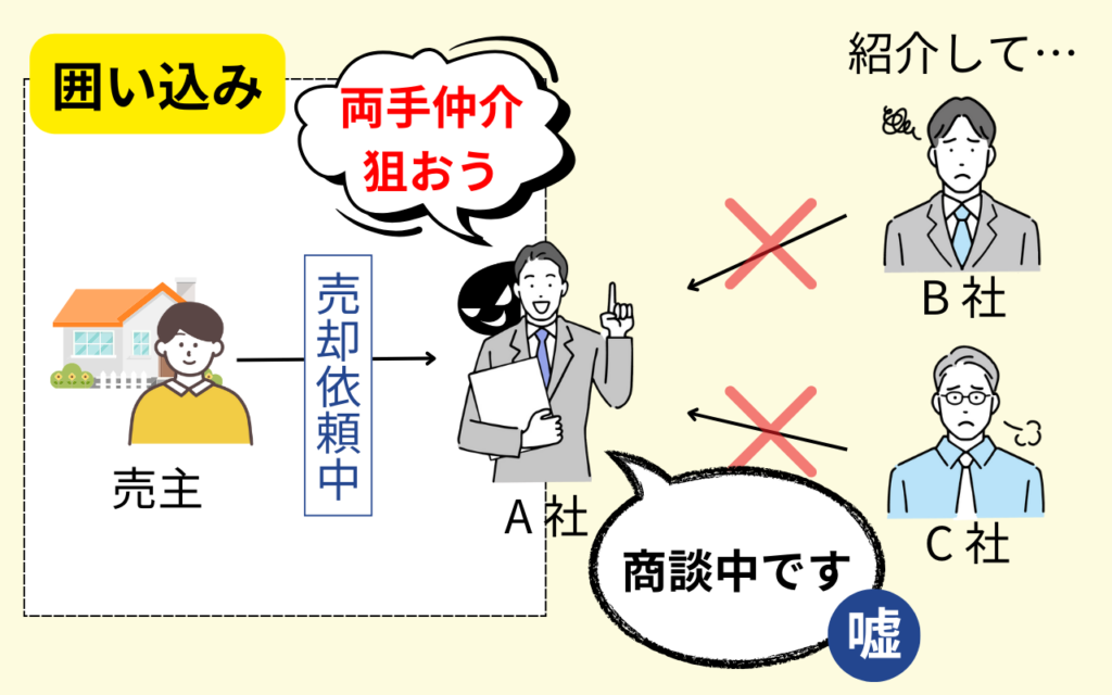 また、不動産会社があなたの物件情報を他社に公開せず、自社の顧客にだけ紹介して、売主と買主の両方から仲介手数料を得ようとする行為(囲い込み)が行われる可能性があります。