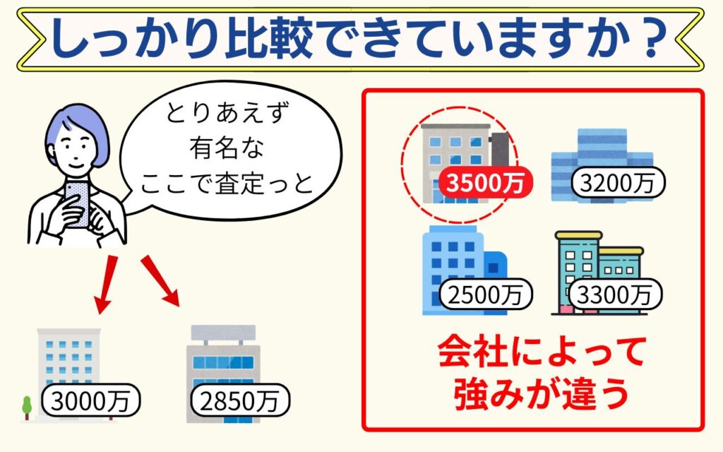 また、売却価格に意識がいきがちですが、仲介手数料なども含めた『最終的にいくら手元に残るか』で会社を選ぶことが大切になります。